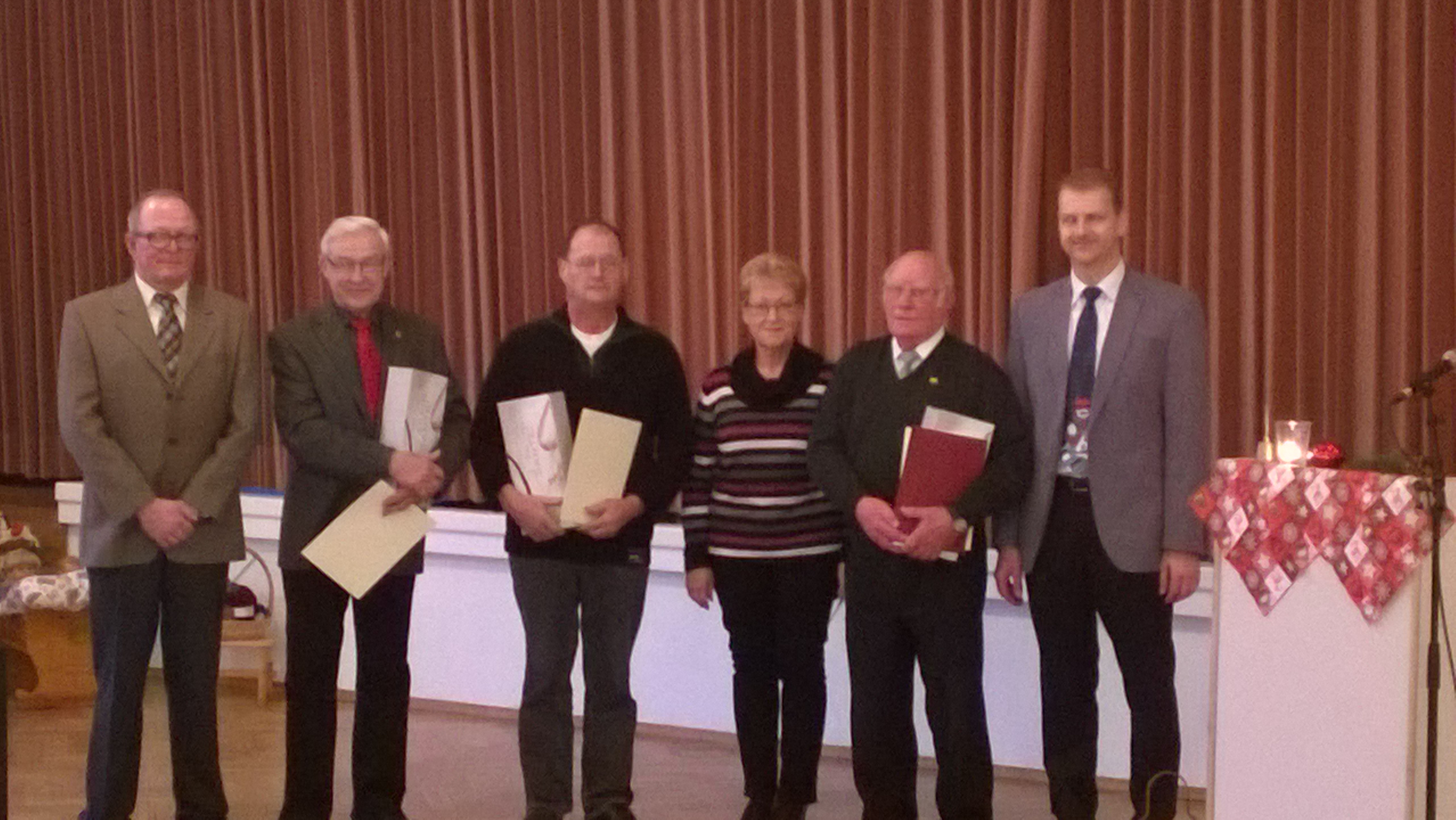 Unser Bild zeigt von links nach rechts: Norbert Demmerle (2. Vorsitzender), Bernd Schick, Peter Barz, Christine Koch (Kreischorverband) , Kurt Metzger und Michael Fischer (Vorsitzender).